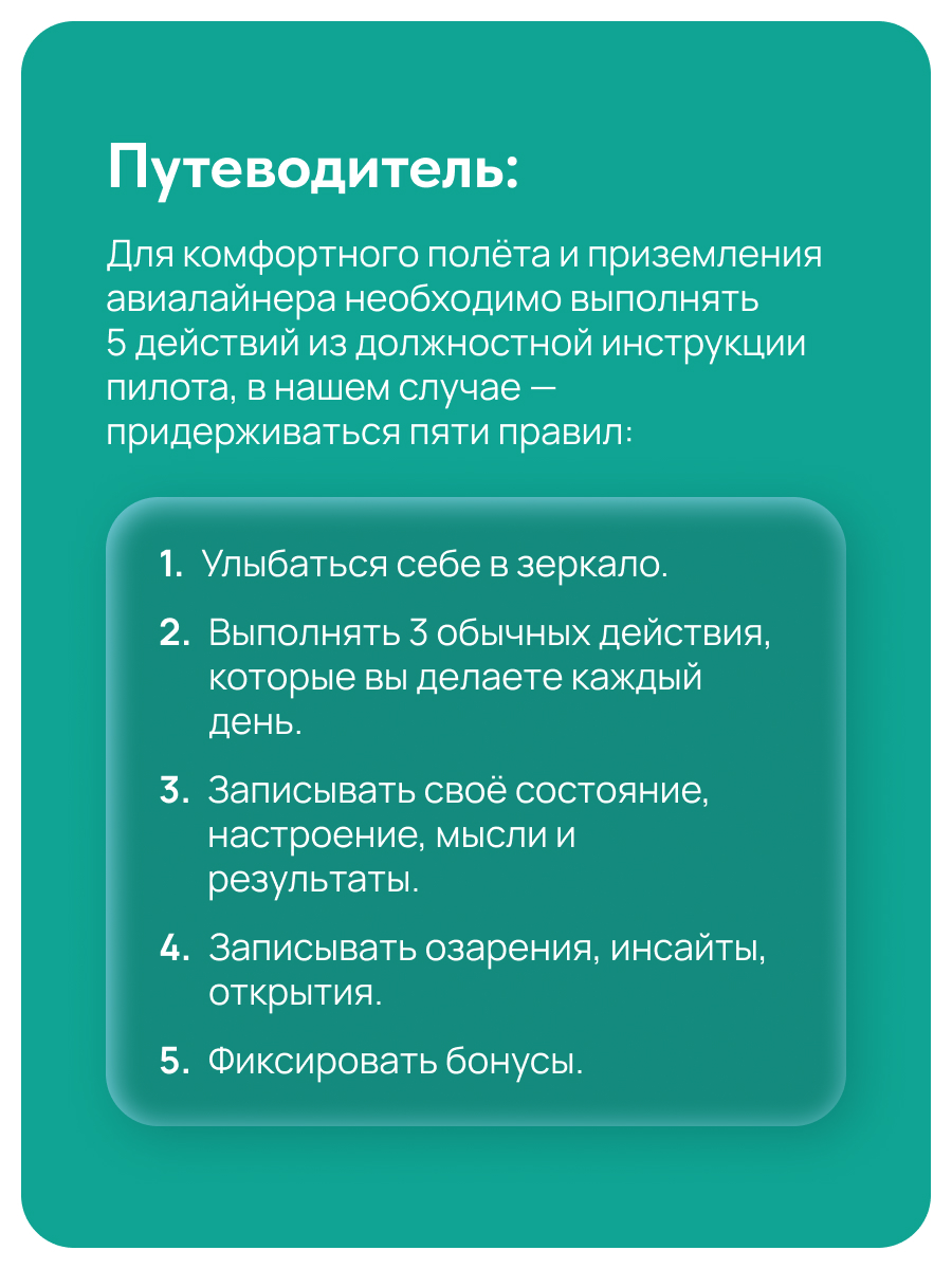 Узнать большеНедатированный ежедневник-мотиватор от Юлии Брантовой, созданный на основе метафоры управления авиалайнером. Помогает внедрить осознанность в повседневность, перестроить фокус с проблем на возможности и наполнить жизнь радостью. Внутри — практические задания в виде 30 челленджей. Самое время бросить себе вызов!