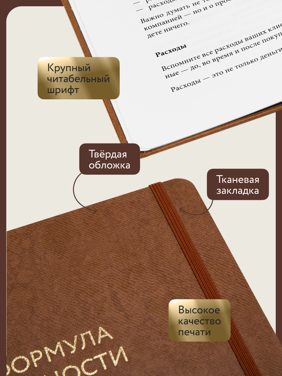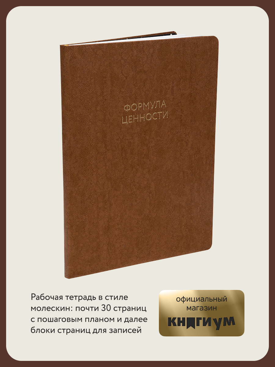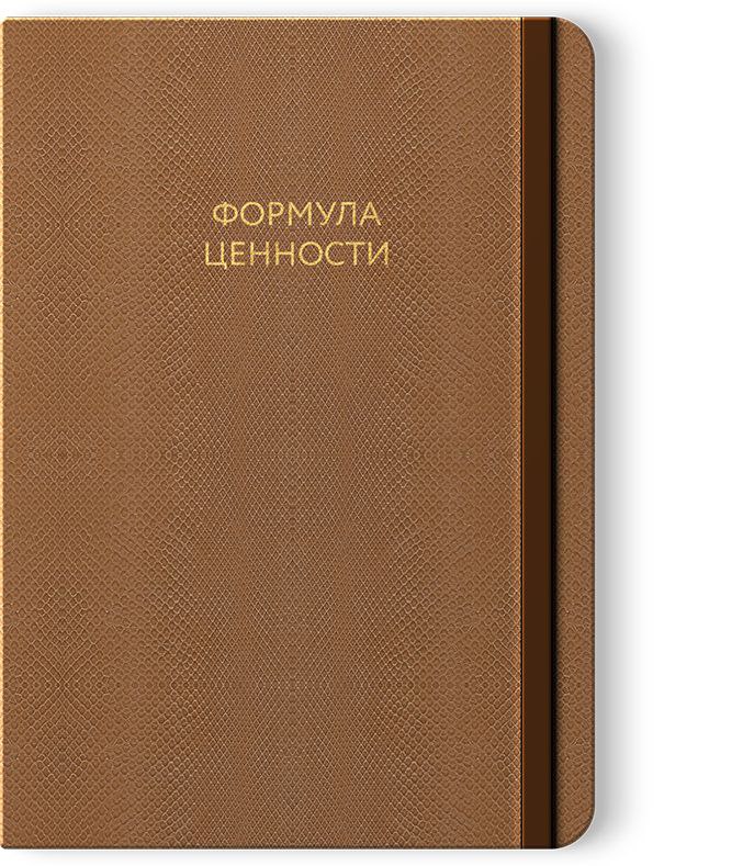 Формула ценности - это рабочая тетрадь в стиле молескин: почти 30 страниц с текстом, пошаговым планом и далее блоки страниц для записей.