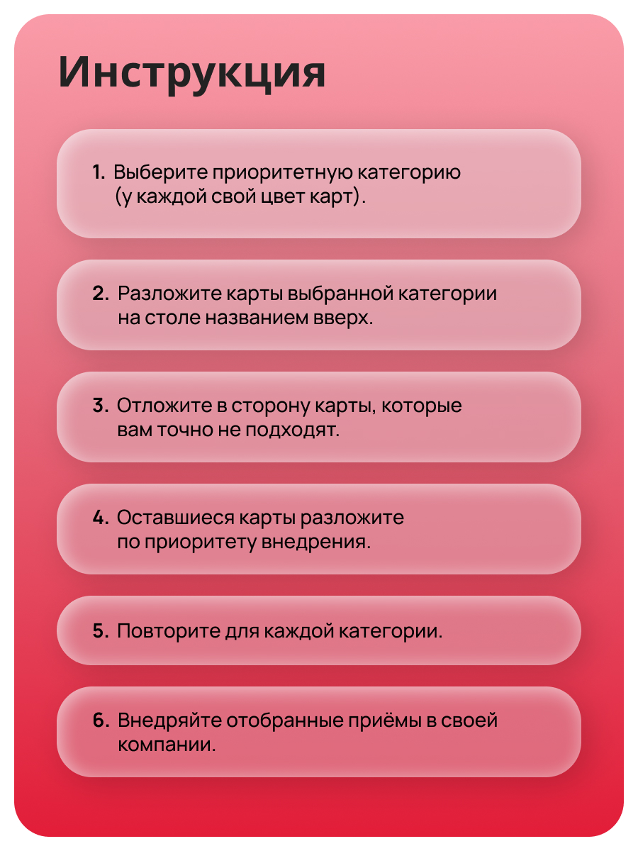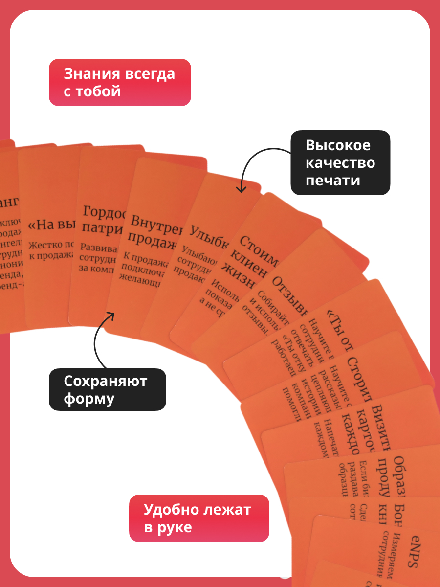 В книге "Продает каждый" собрано множество подробных рекомендаций, применимых для каждой из категорий людей, которых вы можете подключить к вашей машине продаж. В картах - как в шпаргалках - кратко перечислены все варианты. Раскладывайте пасьянс, выбирайте нужную карту и действуйте!