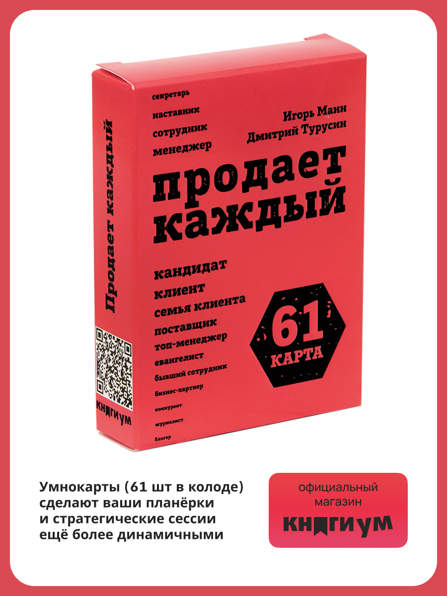 Умнокарты (61 шт в колоде) сделают ваши планерки и стратегические сессии еще более динамичными. Продажи пойдут в рост! Хорошее дополнение к книге "Продает каждый".