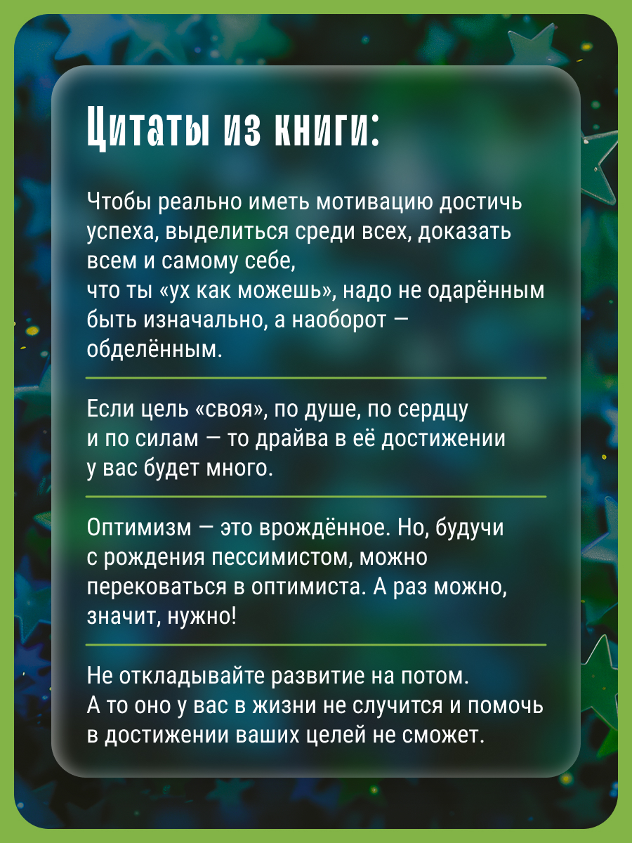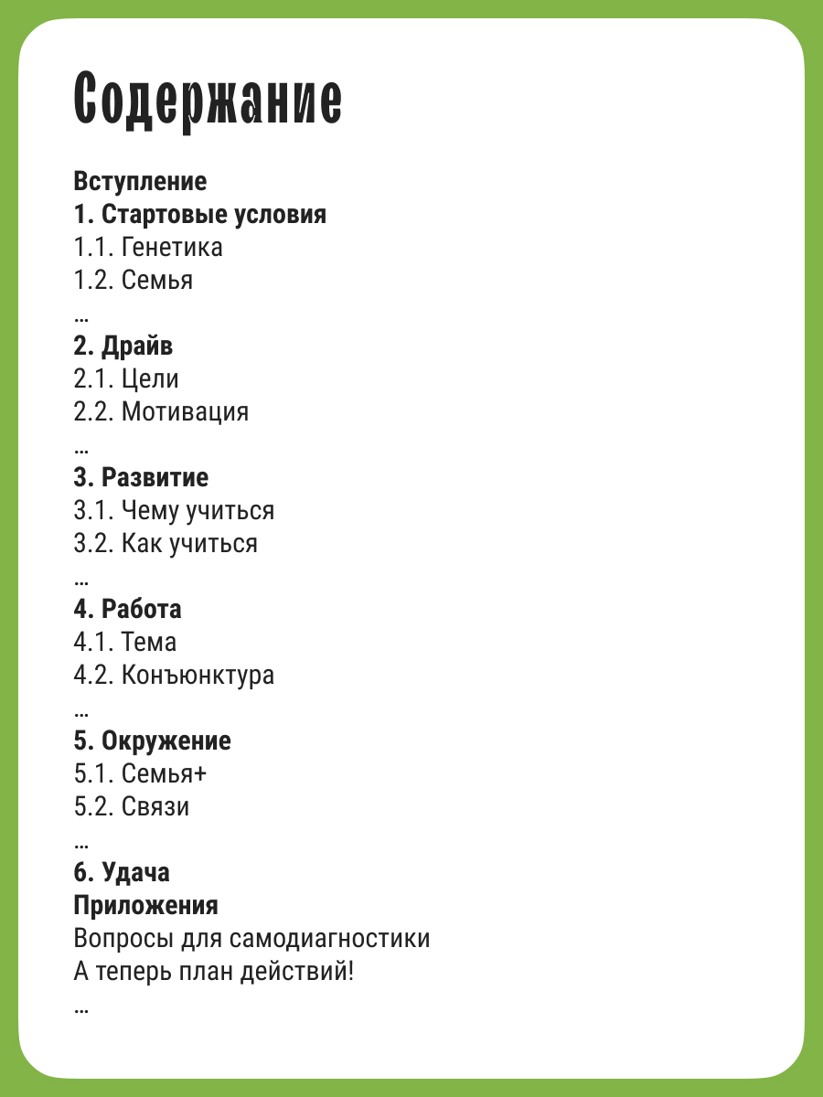 Получилась своего рода рабочая тетрадь, благодаря которой вы увидите, что мешает вам продвигаться к цели, какие факторы развить не удастся, а на каких, наоборот, нужно сосредоточиться, чтобы у вас получилось как можно больше из задуманного.